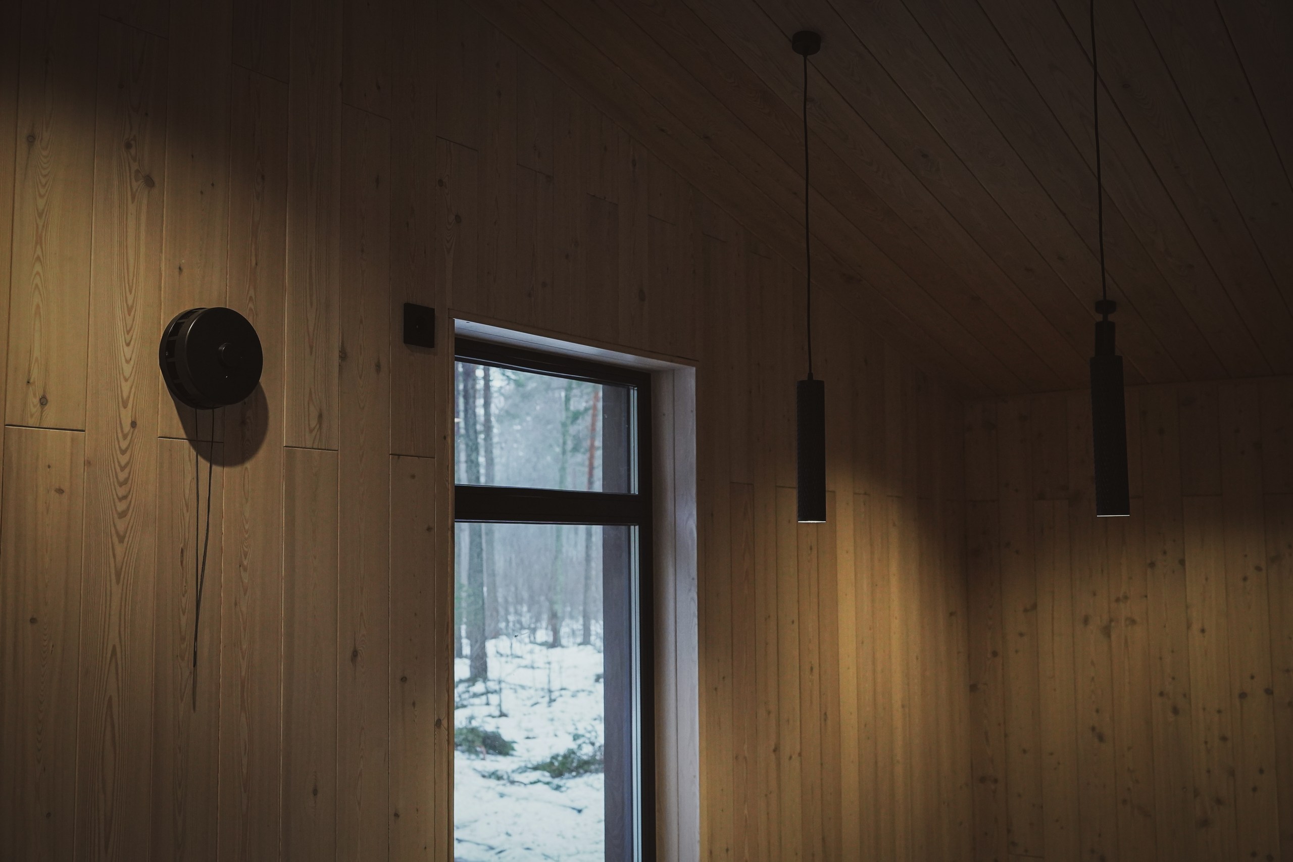 Интерьер дома также выполнен с использованием натуральной древесины – паркетной доски из лиственницы. Удивительно, но паркет может использоваться не только для пола, но и для оформления стен. Благодаря этому решению создается уютная атмосфера внутри помещений, которая гармонирует с окружающей средой и дарит ощущение тепла и комфорта.