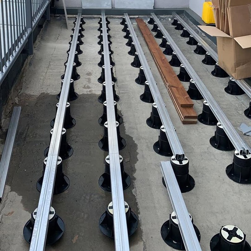 При монтаже террасы мы применяли инновационные решения, обеспечивающие надежность и долговечность конструкции. Прежде всего, использовались регулируемые опоры, позволяющие легко корректировать высоту досок независимо друг от друга. Такое решение особенно важно для городских условий, где поверхности зачастую неровные.